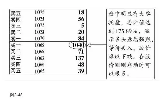 (1)大单托盘。在买档中,如果买方比卖方有明显的数量优势,那么关注这只股票的投资者会认为该股的托单力量比较强大,更倾向于看多。股价先下行几个价位后,庄家在买档垫上大单,然后打出一大笔一大笔的卖单,将买盘逐步消掉。然后,在稍低一点的价位同样垫上大单,再打出大笔抛单。如此反复,让投资者误以为庄家出货而出局。但应注意,这种情况下股价不一定能马上企稳回升,因为在股价下跌过程中,光靠庄家护盘是护不住的,一般股价还会有小幅下跌空间。这时应密切关注此股,一旦市场转强就会有不错的表现。